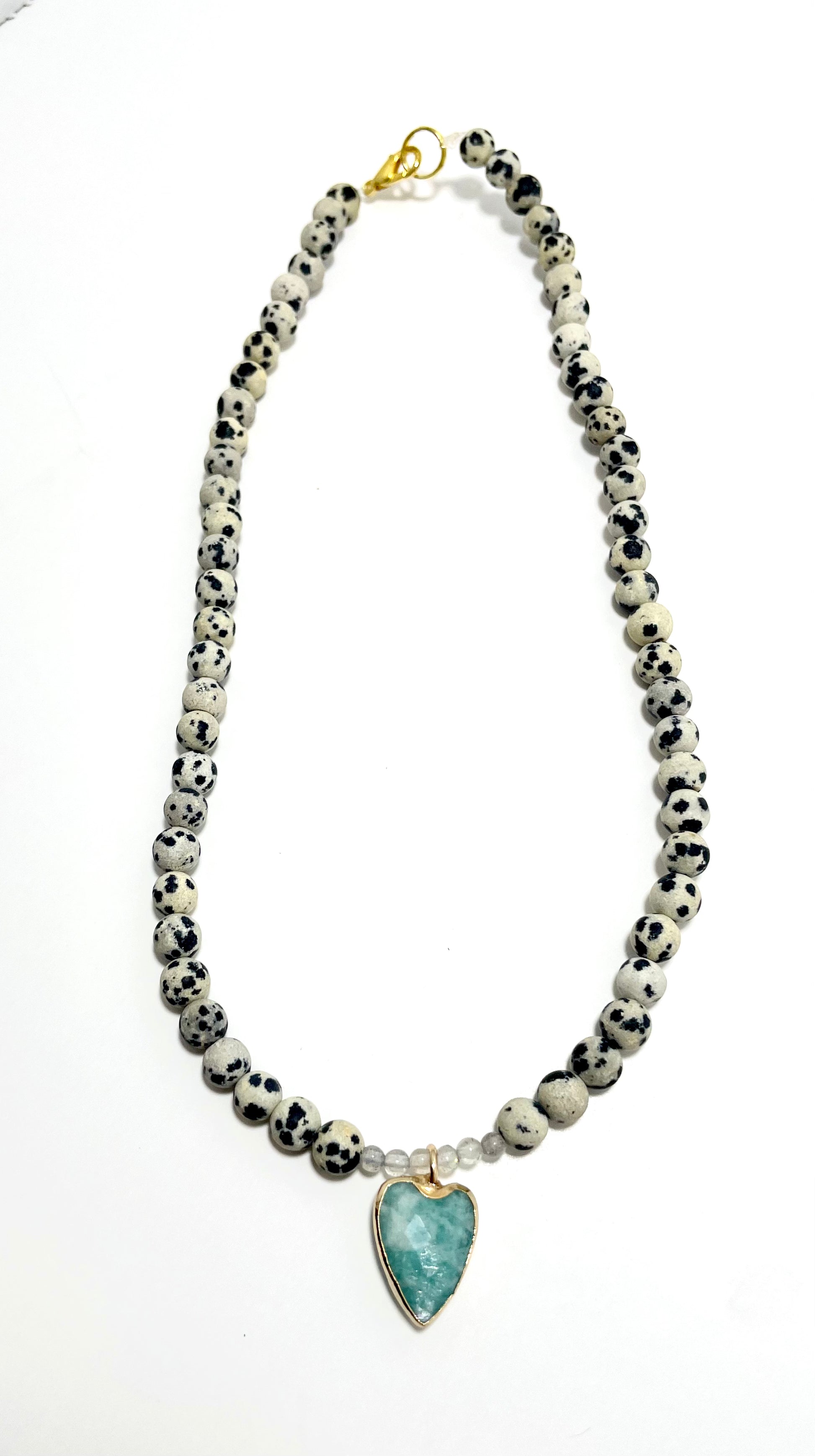 15" Dalmatian Jasper & Labradorite Choker – Aquamarine Heart Pendant