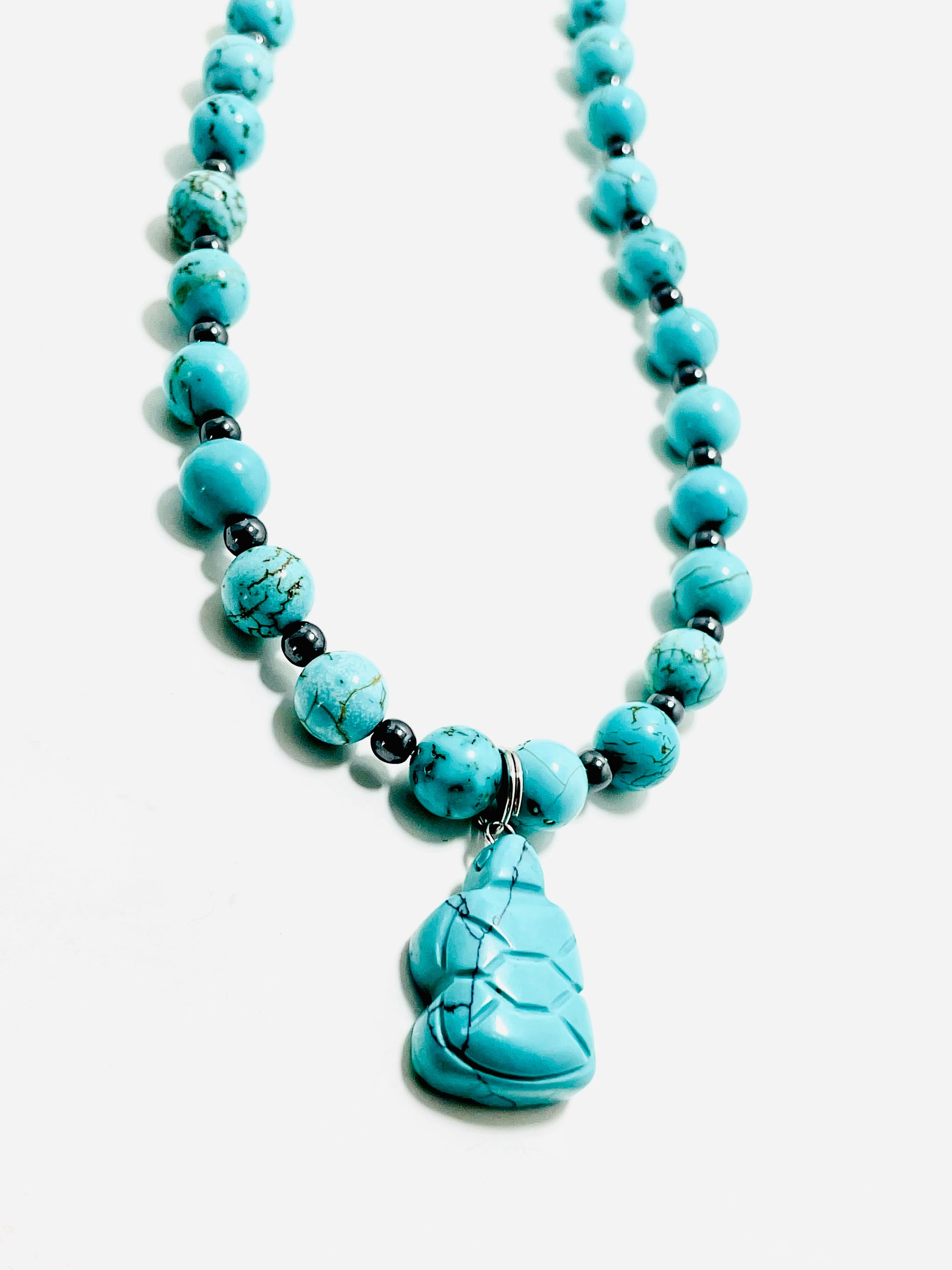 Strung with soothing 8mm Turquoise beadsβknown for healing and communicationβand grounding Hematite beads for protection and mental clarity, this piece creates a balanced blend of serenity and strength. Whether you're navigating emotional waves or seeking stable energy, this necklace brings harmony to your heart and mind.