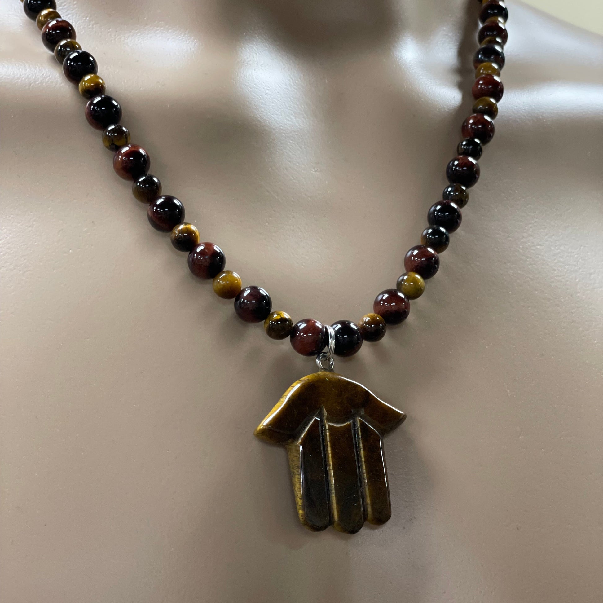 🧿✨ Tiger’s Eye Hamsa Necklace – 23” Hand-Carved with Red & Brown Tiger’s Eye Beads