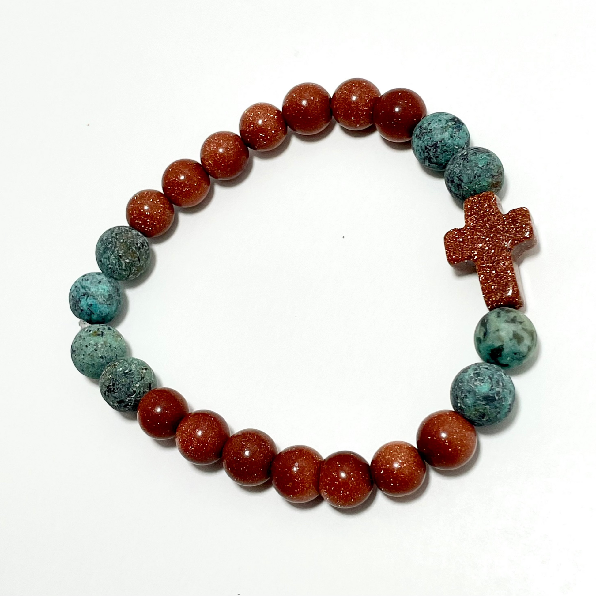 Rooted in faith and designed for bold spirits, the Red Goldstone & Matted African Turquoise Cross Bracelet is an empowering piece that combines the healing properties of Red Goldstone and African Turquoise with the timeless symbol of the cross. The deep reddish-brown of Goldstone brings vitality and ambition, while the soothing greens of African Turquoise inspire transformation and personal growth.