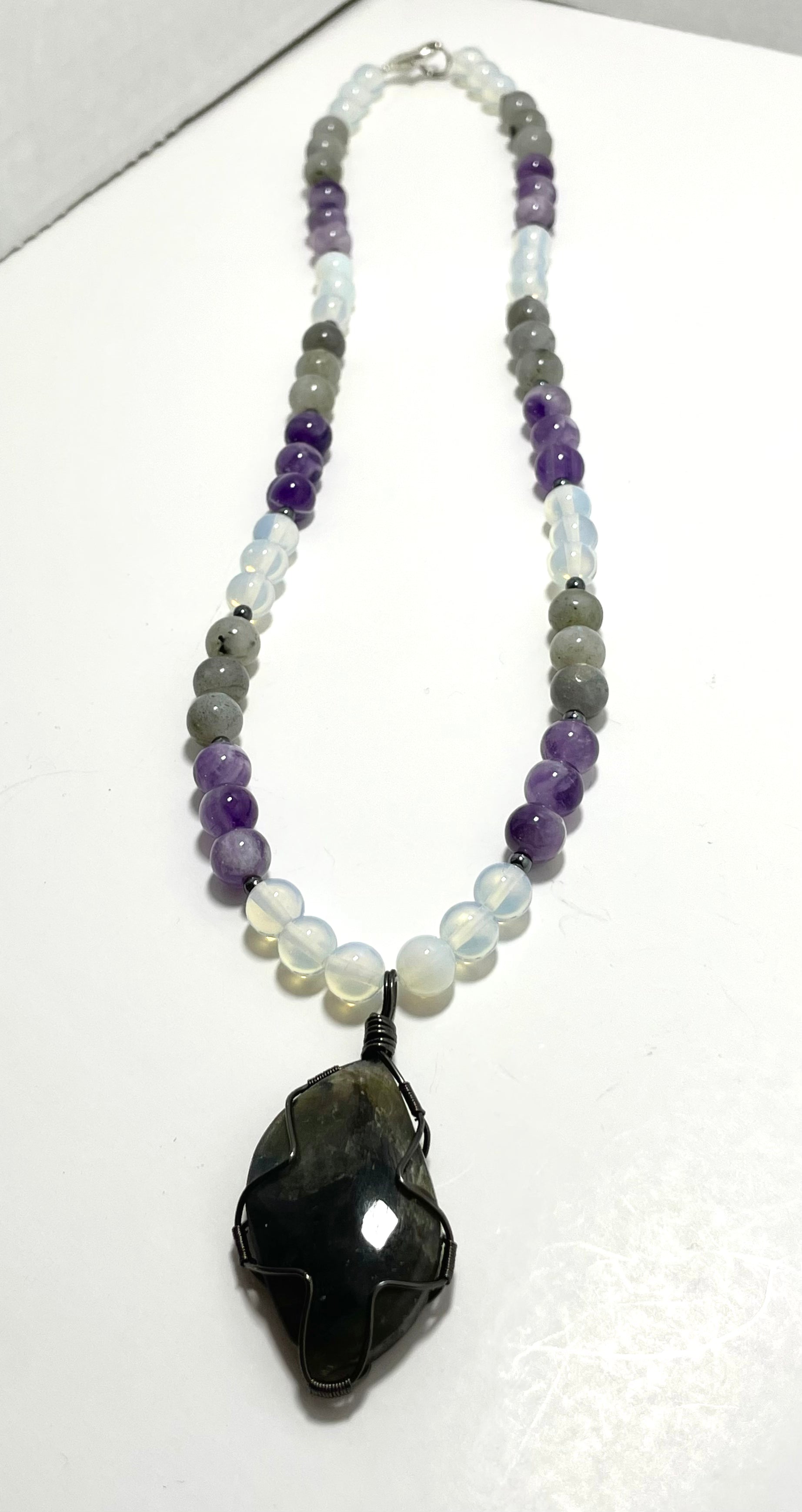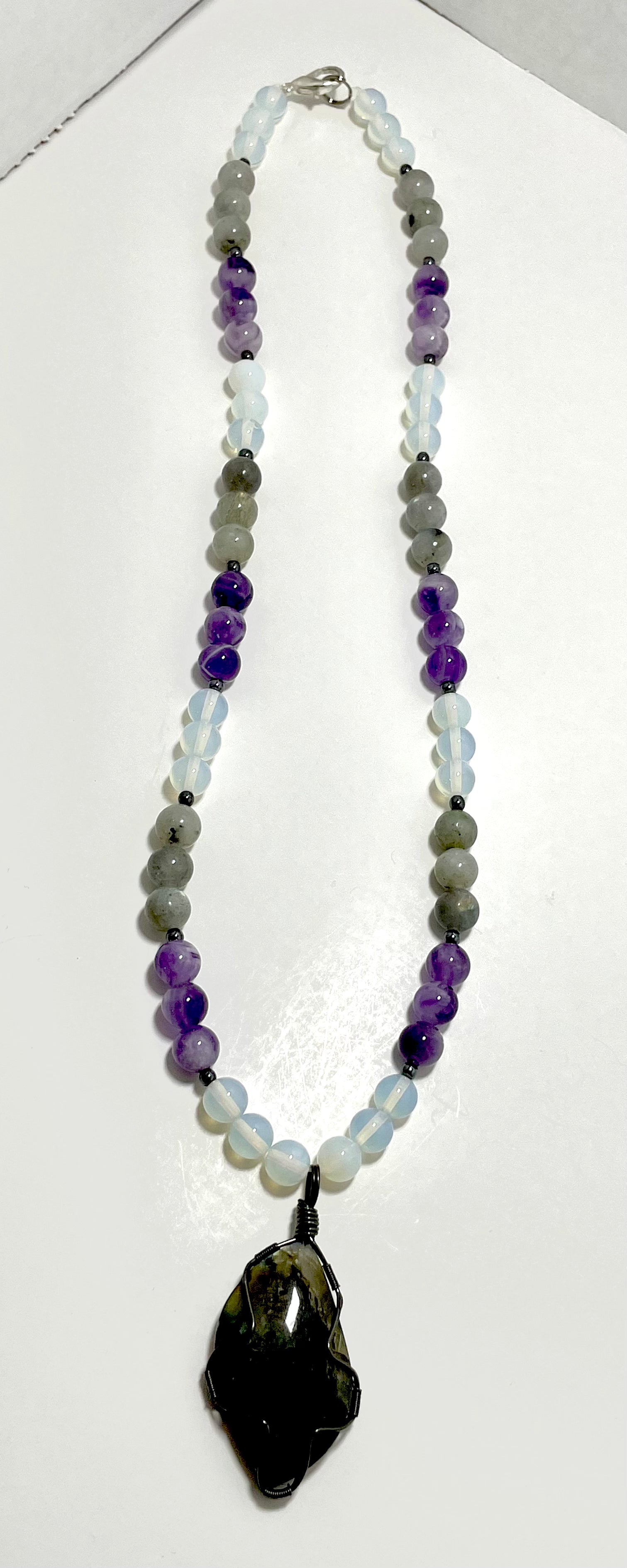 The necklace is adorned with 2mm Hematite beads for grounding and balance, alongside 8mm Opalite, Amethyst, and Labradorite beads that enhance spiritual awareness, calm the mind, and strengthen the connection to higher realms. This stunning combination brings you a sense of peace, protection, and clarity in your spiritual journey.